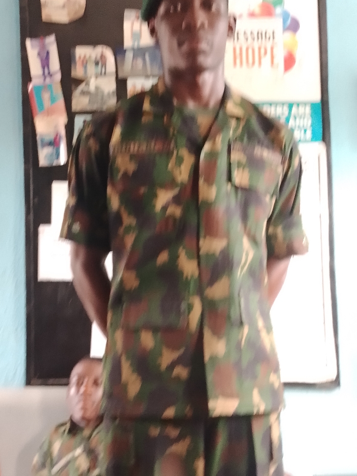 An indoor scene depicts a male individual standing centrally, facing forward, wearing a camouflage military-style uniform and a green beret, with his hands clasped behind his back