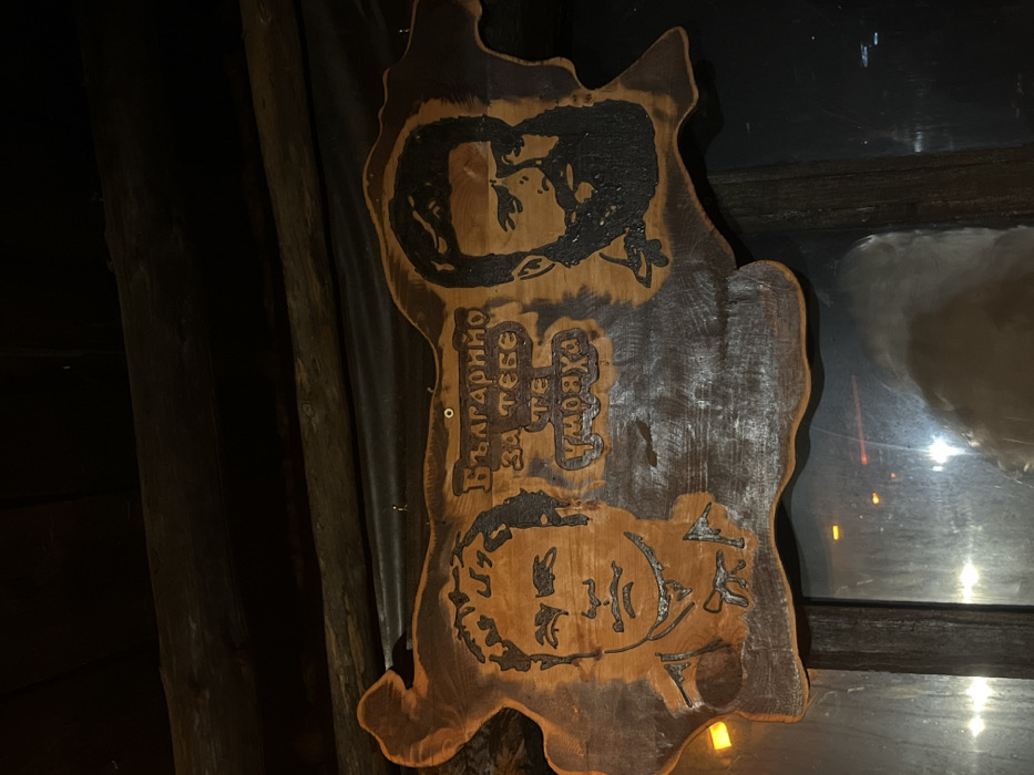 A rustic wooden plaque, shaped as the geographical outline of Bulgaria, is centrally displayed in a dimly lit indoor environment in Zheleznitsa, Bulgaria
