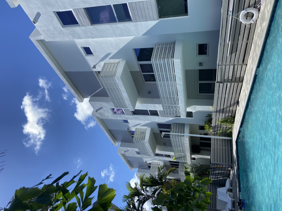 The image displays an outdoor scene in Pompano Beach, United States, featuring a modern residential complex and a swimming pool under a bright blue sky with scattered white clouds