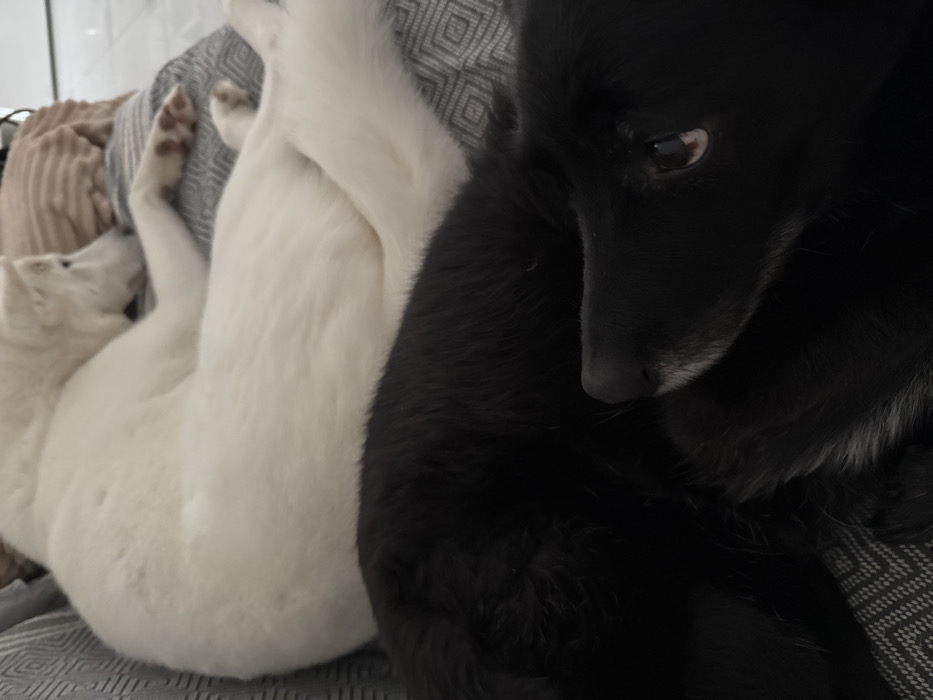 Location: Polje, Montenegro. An indoor scene depicts two domestic canines resting on a textile surface. A large, long-haired white dog occupies the upper portion of the frame, lying on its left side, facing towards the right. Its front and hind paws are visible, displaying light-colored paw pads. Below it, a black-furred dog with medium-length hair is positioned in the foreground, partially obscured by the white dog. The black dog's head is visible in the lower right, with its right eye open and oriented upwards. Both animals appear to be in a state of repose on what resembles a sofa or cushioned seating, covered with a light gray and white geometric patterned fabric. A light brown, textured blanket or pillow is partially visible behind the white dog's head.