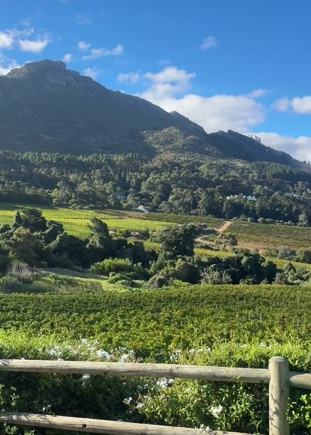 scenic view of a lush vineyard landscape with a mountain in the background under a clear blue sky with scattered clouds. A wooden fence runs along the bottom of the frame. The vineyard extends into the distance, with rows of green vines. The mountain is covered in trees and vegetation. The sky is bright and sunny.
