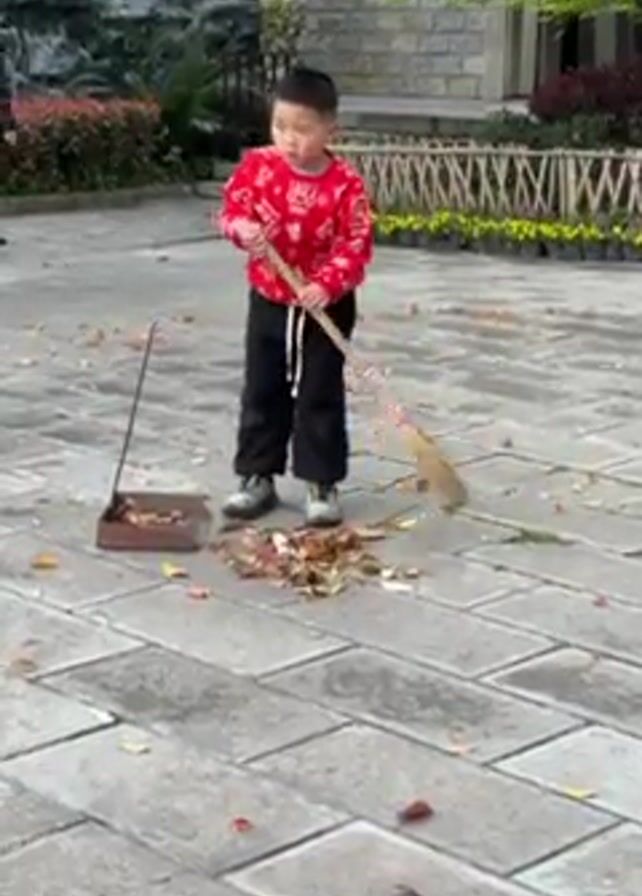 A young boy in a red sweater and black pants sweeps leaves from a brick paved area with a broom. A metal dustpan is on the ground beside him. In the background are plants and a wall. A person walks by in the background.