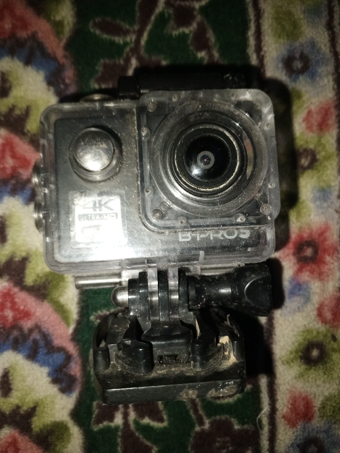 - "A B-PROS action camera in a clear, waterproof housing sits atop a black mounting bracket, both covered in dust and debris" by FM-pltcW2, licensed under CC BY 4.0