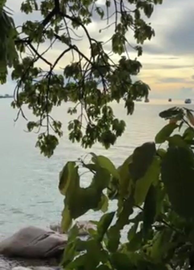 serene view of the sea framed by lush greenery. In the foreground, tree branches with dense leaves create a natural border. Below, large rocks sit at the water's edge. The calm sea stretches into the distance, where the sky is illuminated by the soft hues of a setting sun. Several ships are visible on the horizon, contributing to the tranquil seascape.