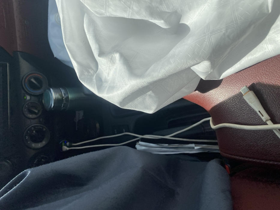 An interior shot depicts a car's dashboard and seating area. A white, textured fabric partially obscures the dashboard. A dark grey fabric occupies the lower left portion of the image. A reddish-brown leather object, possibly a seat or console, is on the right. White charging cables are scattered, one prominently featuring the "Itel" brand. Climate control dials and vents are visible on the dark dashboard to the left. Loose papers are tucked between the fabrics.