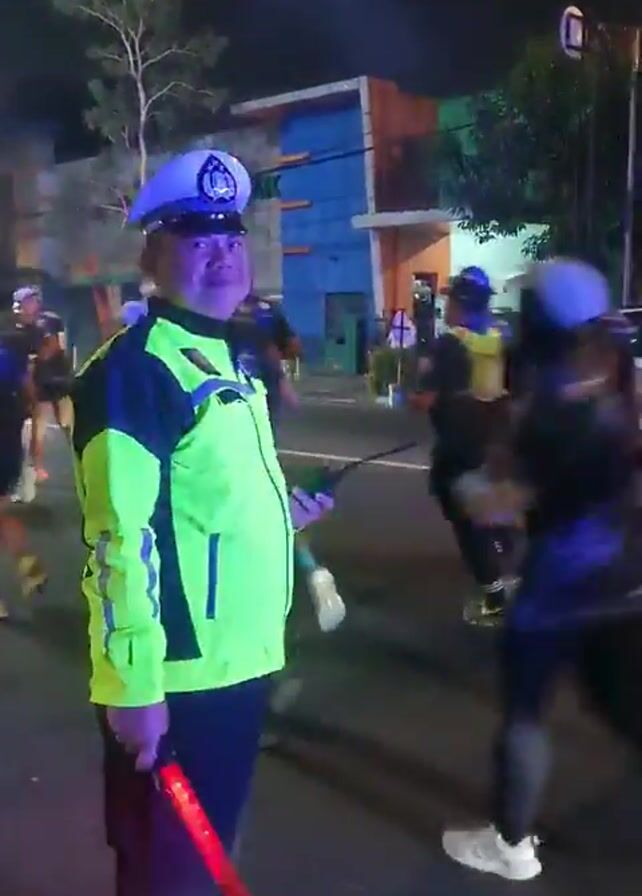 Here is a forensic description of the video: The video appears to be shot at night on a street, possibly in an urban setting. The primary focus is on a traffic police officer wearing a light green and black jacket, a white hat, and holding a red traffic baton. In the background, there are multiple people moving around, some walking and some running. The environment includes buildings, trees, and streetlights. Vehicles, including a silver car, a red motorcycle, and a black SUV, are seen passing by on the road. The SUV has its headlights on and appears to be a police vehicle. Blue lights, possibly from emergency vehicles, are visible in the background. The video appears to capture a scene of street activity with police presence.