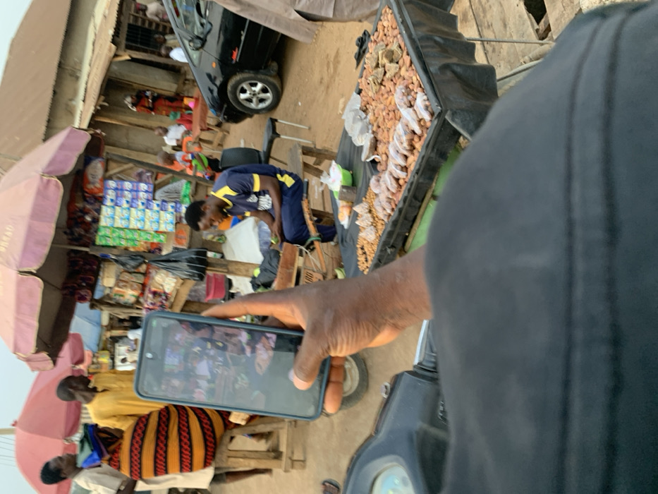 The image depicts an outdoor market scene in Akwanga, Nigeria, observed from a first-person perspective on what appears to be a motorcycle or scooter. In the immediate foreground, a dark-skinned hand holds a black smartphone, displaying a magnified view of the central activity. Directly ahead, a market stall, covered by a black tarp, is laden with various goods: small, light-colored items (possibly nuts or snacks) arranged in rows on the left, and a larger quantity of dark, oval-shaped produce (resembling kola nuts) mixed with lighter, irregular objects on the right. In the mid-ground, beneath a large, reddish-brown market umbrella, a woman in a striped wrapper (orange, yellow, black) sits on a wooden stool, her back partially visible. Two men stand near her, one in a light-colored top and another in a yellow tunic. To their right, another market stall under a similar umbrella displays packaged goods. A man in a blue and yellow shirt is seated on a wooden bench at this stall, focused on an item in his hands. Further in the background, a black car is parked on the unpaved ground. Several individuals are visible in the distance near simple structures with corrugated metal roofs, indicating additional market activity. The ground throughout the scene is unpaved and dusty.