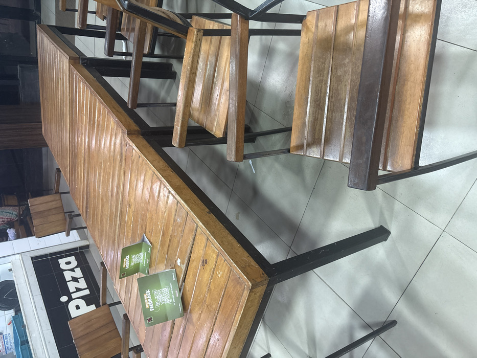 This image displays the interior dining area of a casual restaurant in Jos, Nigeria. The scene is dominated by a long, rectangular dining table, constructed from light brown wooden planks with a dark metal frame and legs, showing visible seams and minor surface wear. Multiple matching chairs, featuring wooden slat seats and backrests with dark metal frames and armrests, are arranged around the table. Two green, folded tabletop signs, each presenting a QR code for feedback and the text "SCAN TO GIVE FEEDBACK," are placed on the table surface. The floor is tiled with light-colored square tiles. In the background, a black wall section is visible, bearing the word "Pizza" in large white capital letters, with a white counter above it where a dark, circular object is situated. A single individual is indistinctly visible in the far background, partially obscured by another chair. No active interactions are depicted; the area appears largely unoccupied.