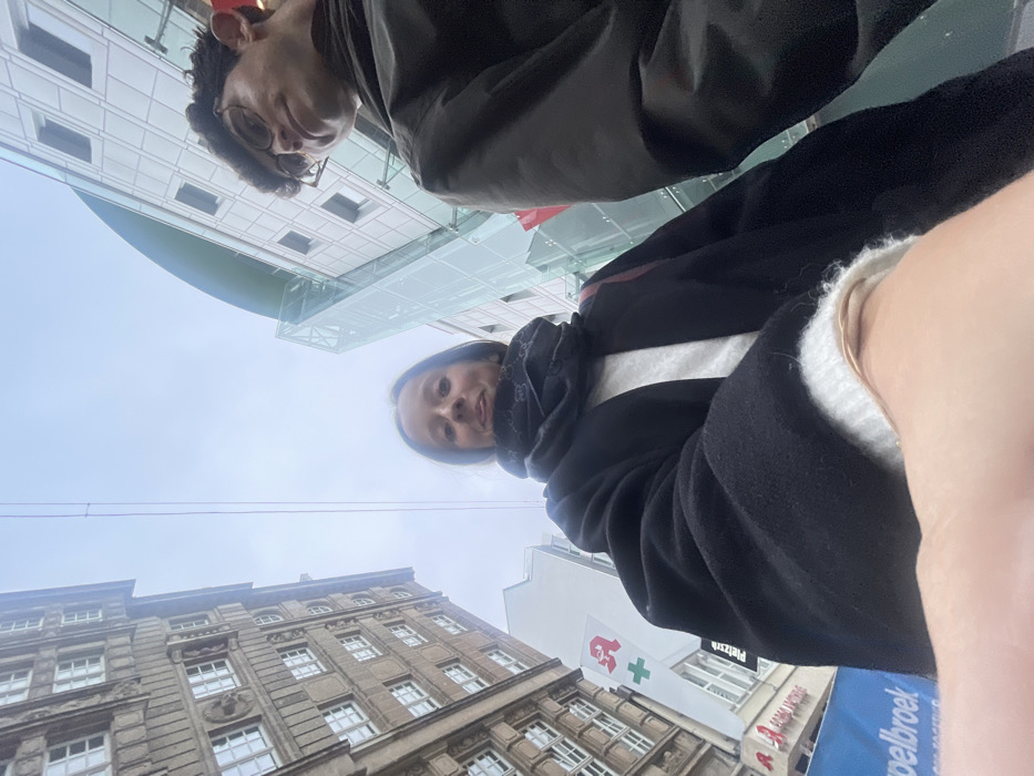 A low-angle, eye-level upward photograph captures two individuals on Westenhellweg street in Dortmund, Germany, beneath an overcast sky