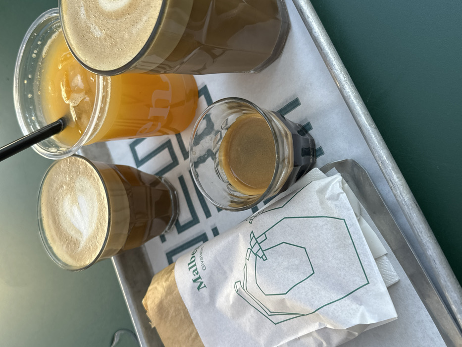 A metal tray holds a collection of drinks and a wrapped item. There are two lattes with foamy tops, a glass of orange juice with a black straw, and a small glass of espresso. A wrapped item, possibly food, sits beneath a white napkin adorned with a green geometric logo and the name "Malbe Givatayim." The tray rests on a green surface.