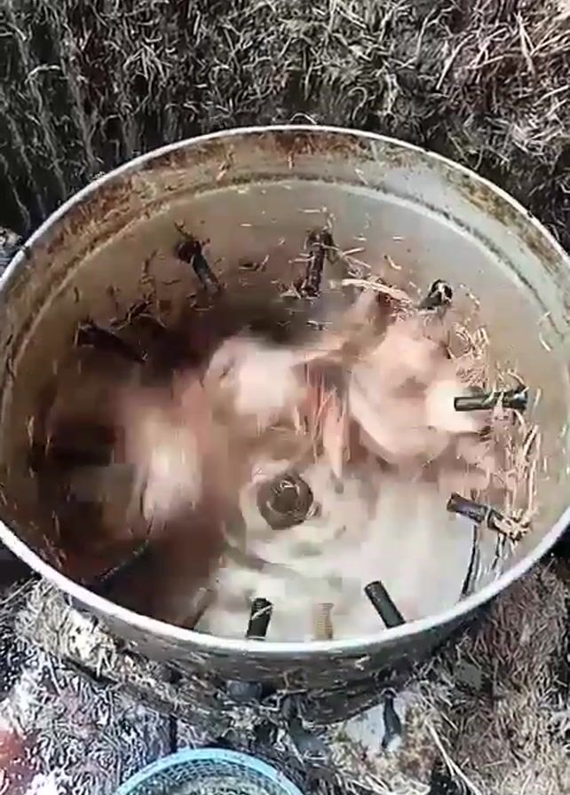 inside of a metal chicken plucking machine. The machine is a cylindrical container with a spinning disk at the bottom. The disk has multiple rubber or plastic fingers attached to it. A dead chicken is inside the machine, spinning and being rubbed by the fingers, which remove the feathers. The machine is surrounded by discarded feathers and other debris.