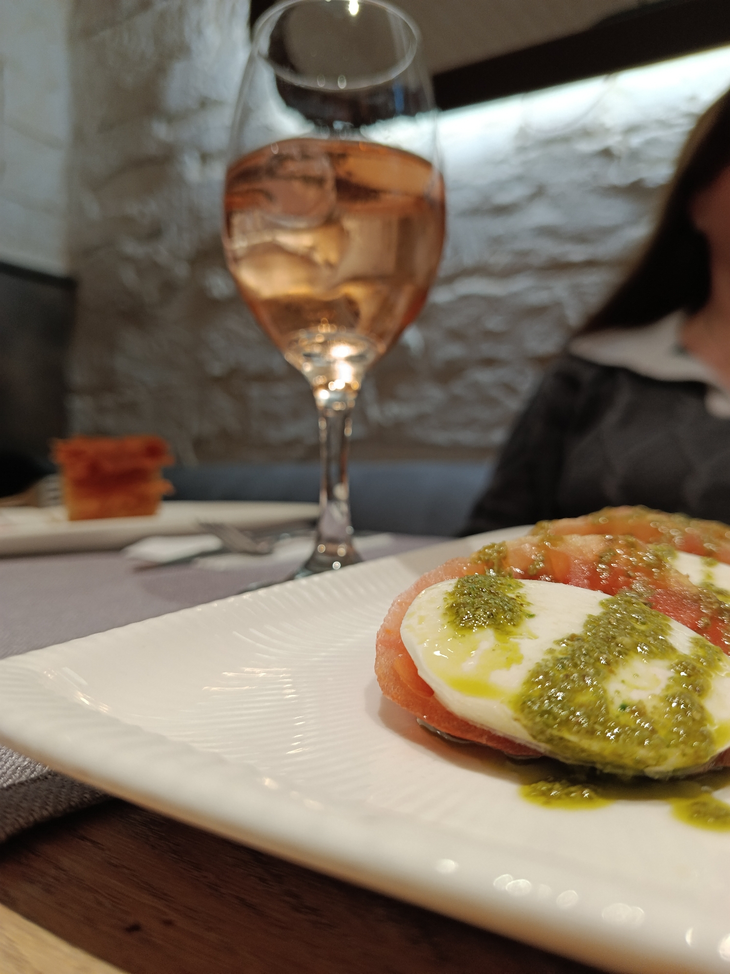 A close-up shows a plate with Caprese salad featuring sliced tomatoes and mozzarella drizzled with pesto sauce. A wine glass filled with rosé wine sits behind the plate. In the blurred background, there is a piece of bread and a fork on a plate, and a person with dark hair is seated. The location is a restaurant, likely in Veliko Tarnovo, Bulgaria, given the request to consider that city. The background also shows a textured white wall, suggestive of an indoor dining environment.