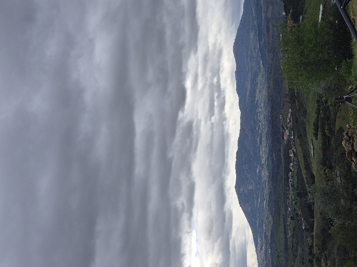 The image displays a panoramic landscape observed from an elevated vantage point in the region of Mirandela, Portugal. The upper half of the frame is dominated by an overcast sky, characterized by dense, uniform grey cloud cover with some lighter patches. The horizon is defined by a prominent mountain range exhibiting varying shades of dark green, brown, and hints of red, indicative of vegetation and exposed terrain. Below the mountains, the mid-distance reveals a valley or rolling plain consisting of green agricultural fields, darker forested areas, and scattered human settlements. Multiple structures with reddish-brown roofs are visible, particularly a cluster of buildings in the lower-left-center portion of the valley. The immediate foreground features dense vegetation, including dark green, broadleaf plants on the left, and a brighter green, bushy plant on the right. A pile of stones or rubble is present in the lower-left foreground. A dark, metallic structure, partially visible on the lower-right edge, extends slightly into the frame, possibly representing a railing or support element. There are no individuals, animals, or discernible actions or interactions within the scene.