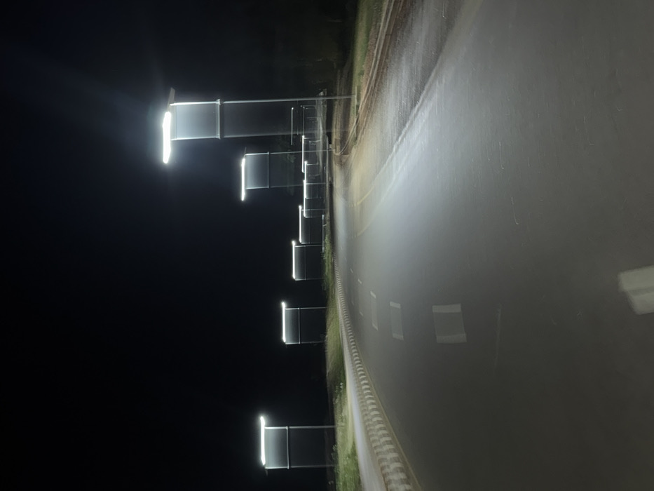This image displays a segment of a paved road at night in Adankolo, Nigeria. The asphalt roadway, exhibiting a reflective sheen under illumination, curves gently to the right in the distance. White, rectangular road markings are visible at intervals along the center of the road surface. A textured concrete curb borders the left side of the roadway, adjacent to a narrow strip of low vegetation. The right side of the road features a less defined curb and a dark shoulder. Multiple modern streetlights illuminate the scene. These tall, metallic poles support rectangular light fixtures emitting bright white light. Several of the streetlights, predominantly those on the right, feature what appear to be integrated solar panels atop their structures. The background consists of a dark, featureless night sky and indistinct vegetation beyond the immediate light cast by the streetlights. No individuals, vehicles, or animals are present in the scene.