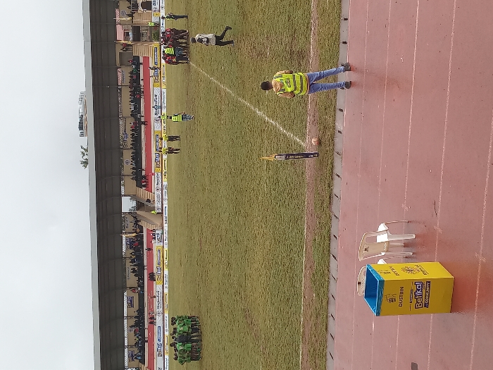 The scene depicts an outdoor sports stadium in Meru, Kenya, under an overcast sky