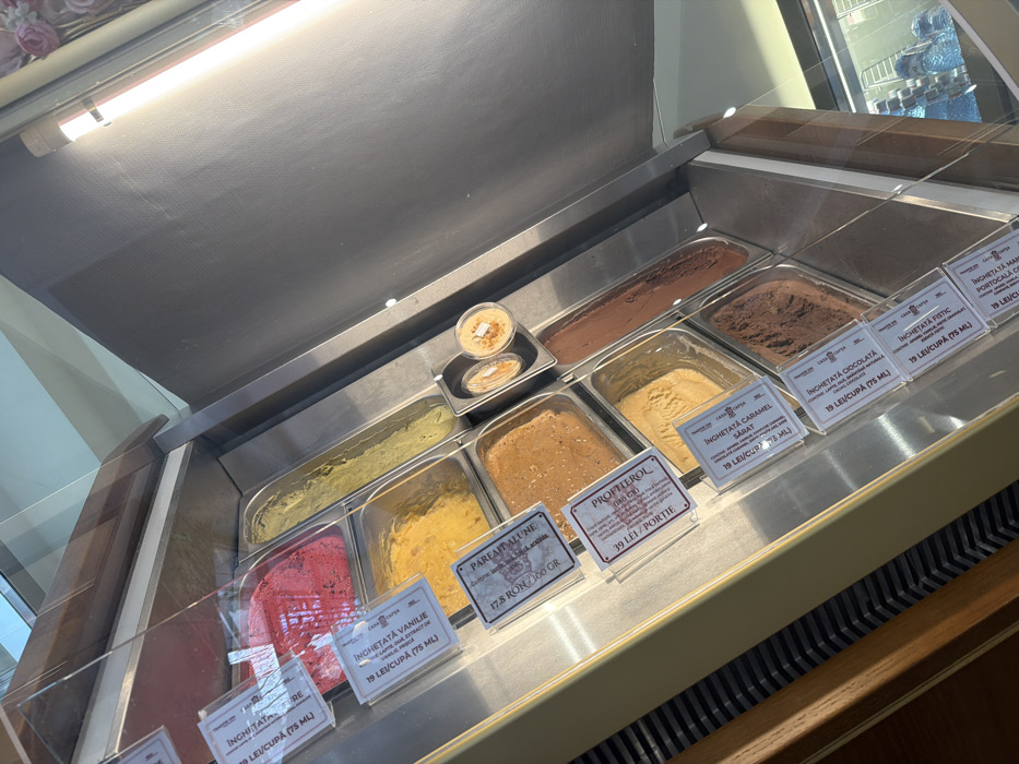 - "This image captures an oblique, elevated view into a brightly lit, refrigerated glass display case showcasing various ice cream and dessert items" by FM-3K6t32, licensed under CC BY 4.0