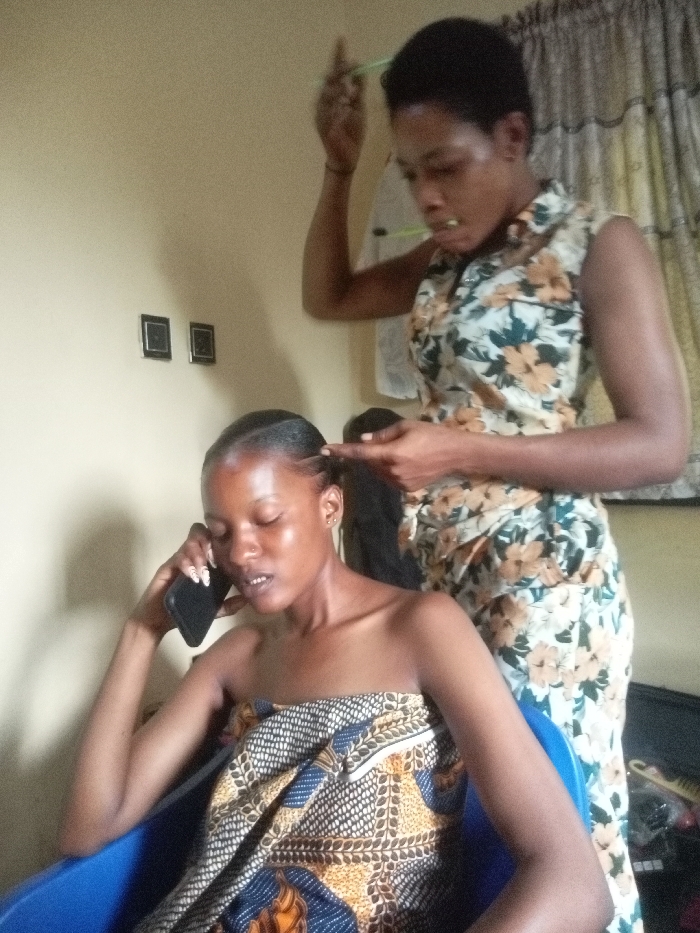 In an indoor setting in Igbenu, Nigeria, two females are engaged in hair styling