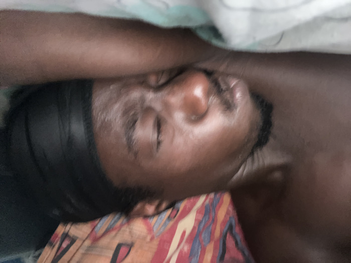 The image displays an individual of dark complexion, appearing to be male, sleeping or resting on their side