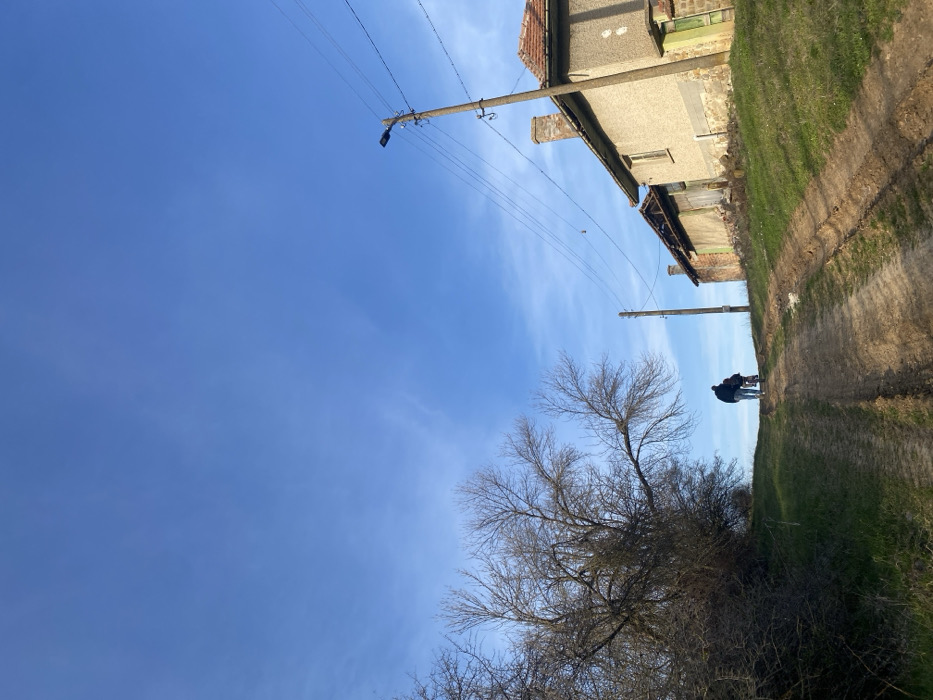 The image depicts an upward-sloping dirt track in Dobri dial, Bulgaria, under a clear blue sky with faint cirrus clouds