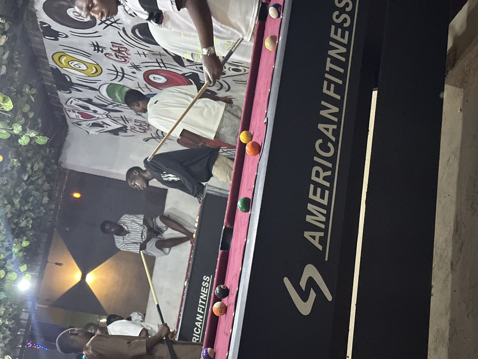 People play pool on a table branded with "American Fitness." One person in a white shirt holds a pool cue, seemingly aiming at a ball. Another individual watches, while another sits on the edge of the table. The background features a wall mural with graphic designs and greenery. The lighting is somewhat dim.