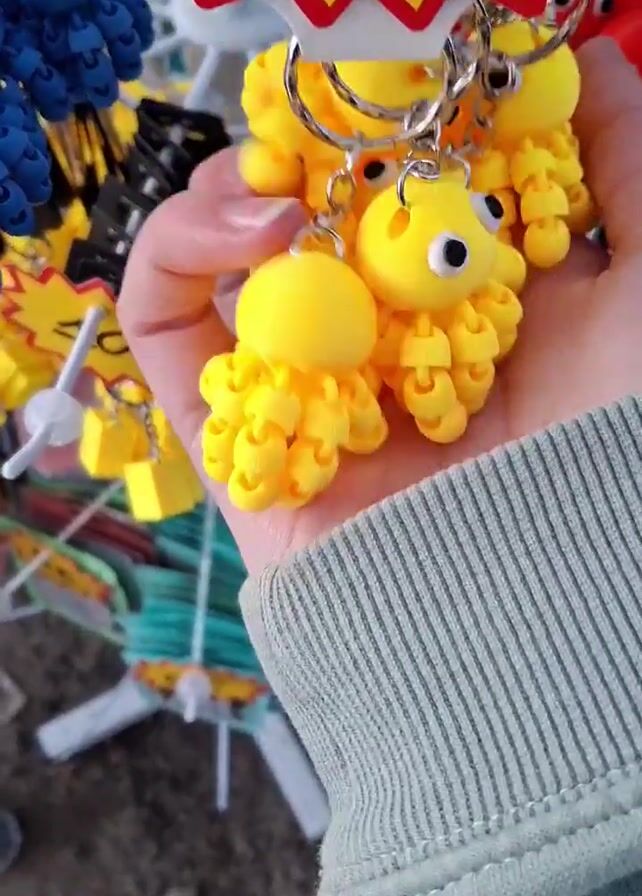 A hand wearing a light green, long-sleeved shirt holds several yellow, octopus-shaped keychains, each with a single eye. The keychains are connected to a silver ring. Other keychains, in red and blue, are visible in the background. A yellow price tag that reads "30€" is also in the background. The ground appears to be paved. The hand moves slightly to showcase the keychains. A musical instrument plays in the background.