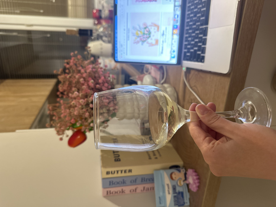 A human hand holds a stemmed glass containing white wine, approximately one-third full. The scene is an indoor environment, likely a residential kitchen or study, with a light wooden countertop serving as the primary surface. To the right, an open silver laptop, connected to a power source and displaying floral graphics on its screen, is positioned. To the left, a stack of four books is visible, with spines reading "Book of Jam," "Book of Bread," and two copies titled "BUTTER." Behind the books and wine glass, a large arrangement of pink baby's breath flowers and a single red artificial flower rests in a white ridged vase. Further background elements include wooden cabinetry, a partially visible window with horizontal blinds, a dark bottle with a cork stopper, and a white ceramic container. A blue pouch labeled "getwell BURUN BANDI" and a small pink ruffled object are situated on the countertop to the far left. The image provides no identifiable markers for a specific location within Sofia, Bulgaria.
