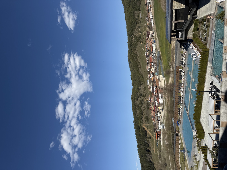 An aerial view captures a sunny day in Bania, Bulgaria, looking towards a village nestled against a forested hillside. The upper third of the image is dominated by a clear blue sky with a horizontal band of dispersed white cumulus clouds. Below the sky, a verdant, irregular hillside covered with coniferous trees slopes down, revealing patches of dry grass and dirt trails. At the base of the hillside, a cluster of residential buildings forms the village, characterized by multi-story houses with varied roof colors, including red and orange tiles, indicative of traditional Bulgarian architecture. Dirt roads and green fields intersperse the village structures. In the midground and foreground, a contemporary outdoor thermal spa complex is visible. It features multiple geometric swimming pools with light blue water, including a large rectangular pool, a smaller adjacent pool, and several irregular-shaped pools with people immersed in them. Numerous white and dark lounge chairs are arranged around the pools, many occupied by individuals in swimwear. Some areas are shaded by white canopies. Low green hedges and landscaped pathways delineate different sections of the complex. To the right, a modern, multi-story building with dark stone cladding and large windows is present, featuring a prominent array of solar panels on its roof and an external staircase. A lone individual in swimwear is visible near a pool in the lower right foreground, descending steps. The overall impression is one of a recreational resort setting adjacent to a traditional village, under clear, bright daylight.