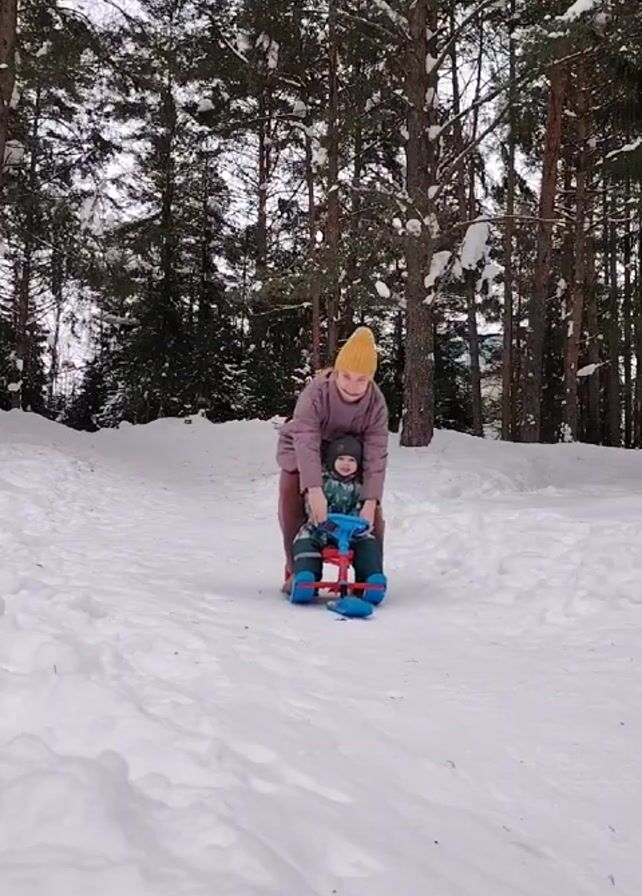 A woman in a yellow hat and mauve jacket pushes a toddler in a green snowsuit down a snow-covered hill on a red and blue snow scooter. The toddler sits on the scooter's seat, holding the handlebars. The hill is in a forest covered with snow.