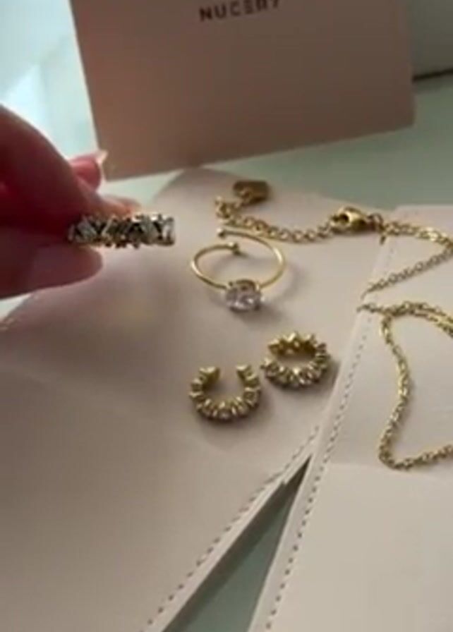 A close-up shot shows a woman's hand interacting with several pieces of gold-colored jewelry laid out on a light pink surface. The jewelry consists of a ring with rectangular gemstones, a simple ring with a single round gemstone, a pair of ear cuffs adorned with small gemstones, and a delicate chain necklace. A light pink box with the word "NUCERY" printed on it is visible in the background. The surface has a segmented design, with the jewelry placed in separate compartments. The woman's hand moves the ring with rectangular gemstones.
