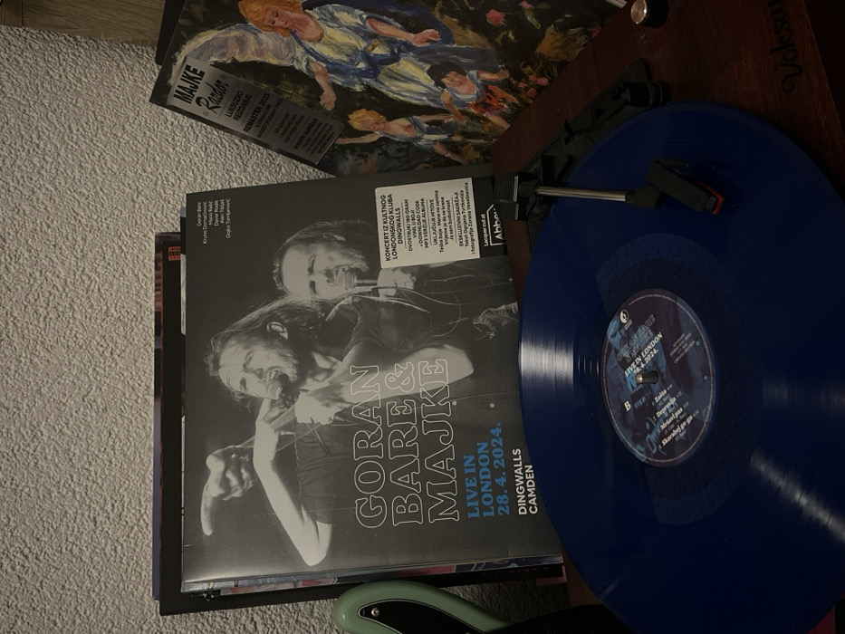 The image showcases vinyl records and their covers. There are two records, one blue and one obscured. The blue vinyl features "Ocean Dark," "Live in London 28.4.2024." with track titles listed. There are also the album covers of "Goran Bare & Majke Live in London 28.4.2024" and "Majke Razdor." The image also shows details like "Koncert iz kultnog londonskog kluba Dingwalls." and "Luksuzno Reizdanje Remaster 2023." This suggests the records are live recordings and reissued material.