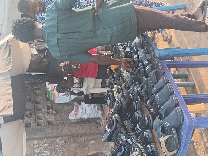 A street vendor stands near a rack brimming with diverse sandals and shoes, predominantly black, on a multi-tiered blue rack. The vendor wears a black t-shirt, red shorts, and a gold bracelet, holding something yellow in his hand. Two customers are present; one in a blue patterned shirt and brown pants, the other partially visible at the top of the frame. The setting appears to be an outdoor marketplace.
