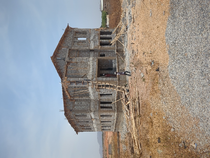 This image depicts a construction site in Karsana 2, Nigeria, under a clear light-blue sky