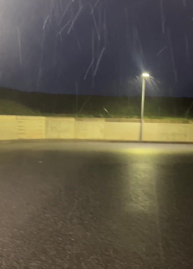 The video depicts a heavy downpour at night