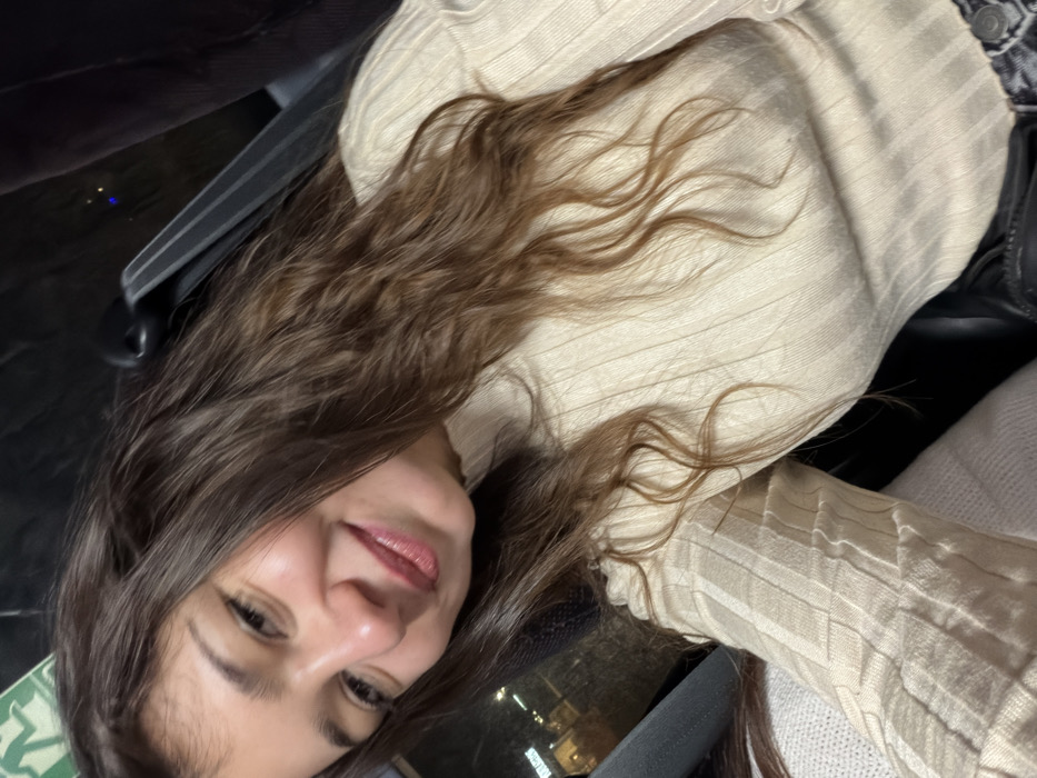 A woman poses for a selfie indoors, likely in a car, wearing a light beige ribbed top. She has long, wavy brown hair. A seatbelt is visible across her shoulder. The background shows a blurred view of a city at night through a window. She has a warm smile and appears to be in a relaxed, comfortable setting. The image has an intimate, personal feel.