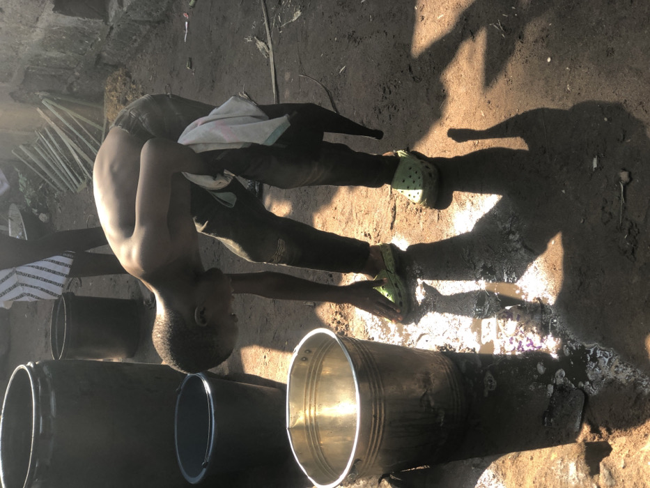 This image, captured in Orifite, Nigeria, displays an outdoor environment under direct sunlight. A dark-skinned male individual, shirtless and wearing dark jeans with ripped sections and lime green Crocs, is bent forward. His head is downcast, and his left hand makes contact with a wet, muddy patch on the dirt ground. He holds a white fabric cloth in his right hand, which hangs alongside his right leg. To his immediate left, a large, reflective silver metal bucket is visible, resting on the ground and partially filled with liquid. Further to the left and behind, a dark blue plastic bucket stands. In the background, a large black cylindrical drum and another dark bucket are present. The lower half of a second individual, wearing white and black patterned attire, is partially visible in the upper left background. The ground is composed of uneven, dry dirt with several distinct wet areas reflecting intense sunlight, creating prominent shadows of the subjects and objects. A wall structure and scattered debris are discernible in the far background.