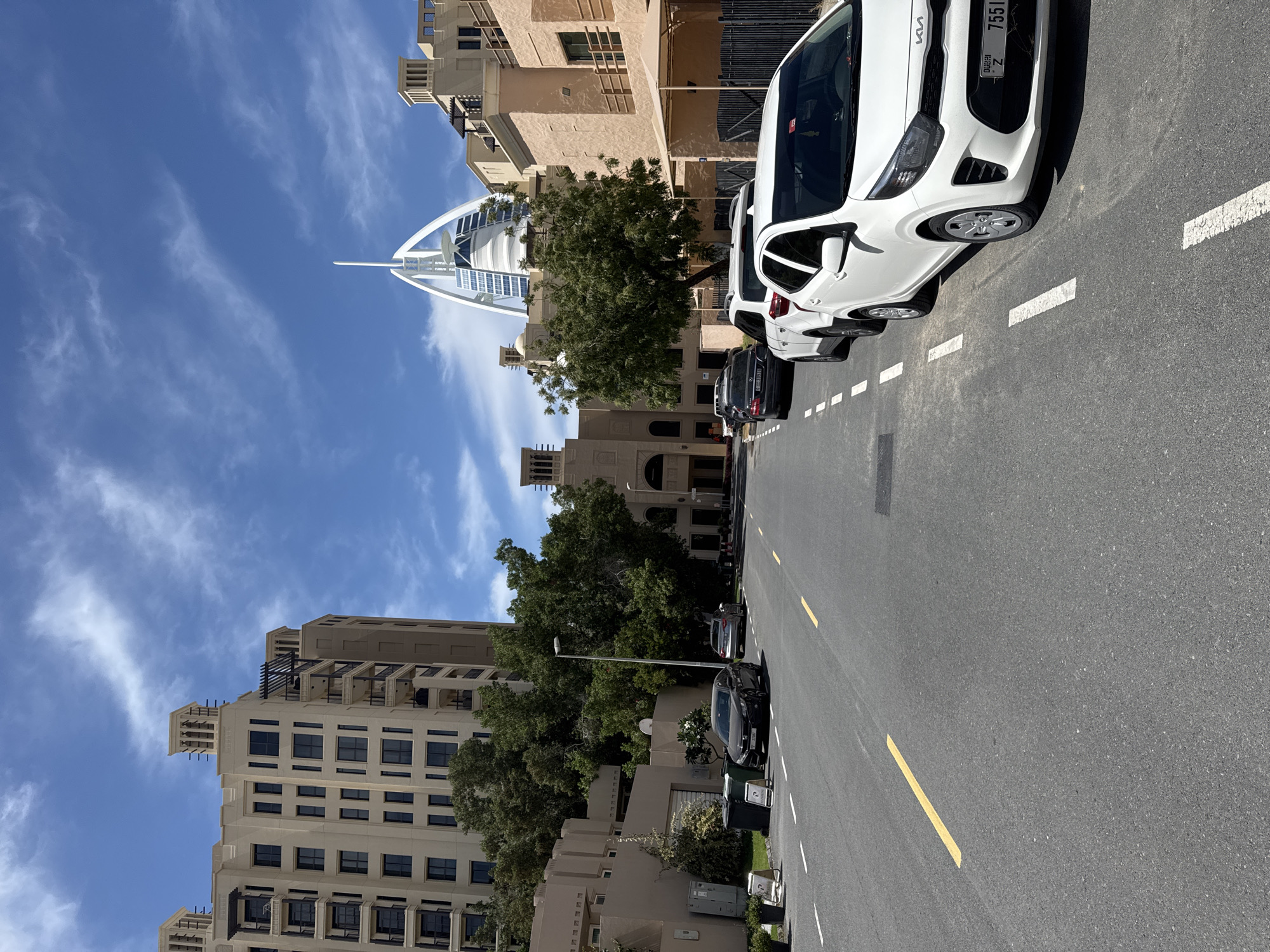The image displays a street scene in Dubai, United Arab Emirates, with the Burj Al Arab Jumeirah visible in the distant background. The sky is bright blue with scattered white, wispy clouds. The viewpoint is from the asphalt road, which features faded yellow dashed lines in the center and white dashed lines marking parking bays along the right side. On the right, three vehicles are parked: a white Kia Picanto compact car with a Dubai license plate (Z 75514) is in the foreground, followed by a white Mercedes-Benz compact SUV, and a black Mercedes-Benz sedan. On the left side of the street, a dark-colored Honda Civic sedan is parked near two dark green trash bins and a white "P" parking sign, with a silver sedan parked further behind it. No individuals are visible. Buildings line both sides of the street. On the left, a tall, multi-story building with a light beige facade, numerous dark-paned windows, and balconies with dark railings stands prominently, topped with traditional wind-tower structures. Lower beige buildings, partially obscured by dense green trees, are also present on this side. A gray streetlamp pole extends from the left. On the right, lower-rise, tan-colored buildings with textured facades, balconies, and some traditional architectural details, including an attached awning, are visible behind a dark metal fence. Dense green trees are interspersed along the street, partially obscuring the lower portions of the buildings.