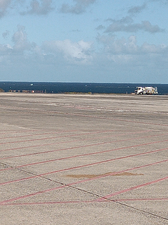 The image displays an airport tarmac in Telde, Spain, situated adjacent to a large body of water under a partly cloudy sky. The foreground features a grey concrete surface marked with numerous parallel red lines receding towards the horizon, interspersed with fainter white lines further back. An irregular, elongated light brown stain is visible on the concrete in the lower middle-right. A strip of dark land or infrastructure separates the tarmac from the water. In the midground, a white utility truck, characterized by various colored components on its rear, is positioned on this land strip towards the right. The background is dominated by the dark blue expanse of the Atlantic Ocean, with several small, white, indistinct objects visible on its surface. The sky above is light blue with scattered white cumulus clouds. No individuals are present in the frame.
