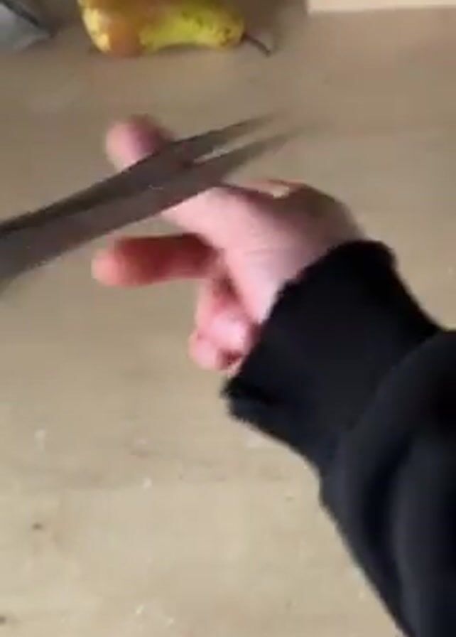 A person is holding a pair of metal tweezers in their right hand, which is clad in a black sleeve. The tweezers have a brushed metal finish and are held against a light-colored wooden surface. A pear is out of focus in the background. The hand rotates the tweezers to show both sides.