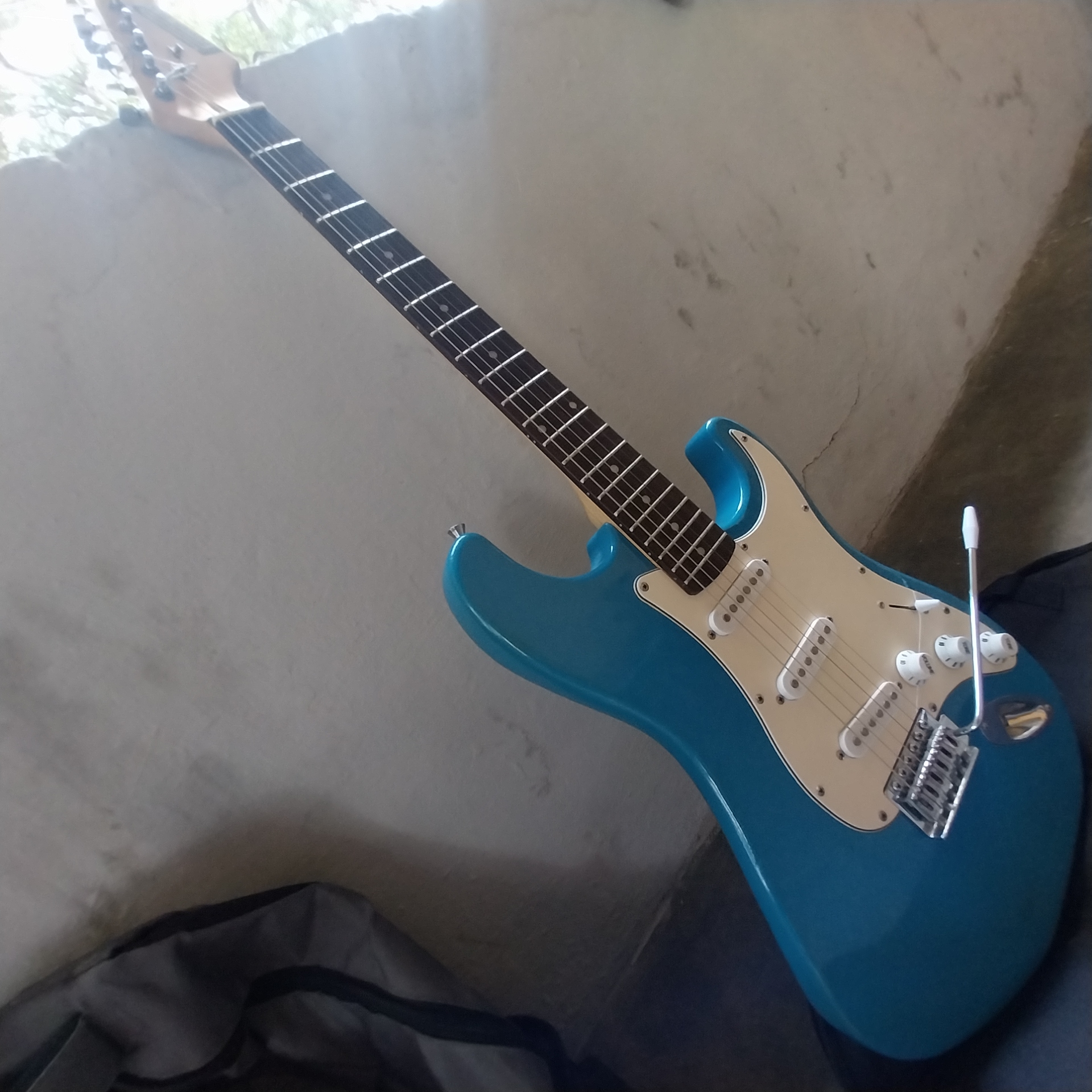 - "A blue electric guitar with a white pickguard and silver hardware is positioned in a semi-outdoor setting" by FM-zBmG82, licensed under CC BY 4.0