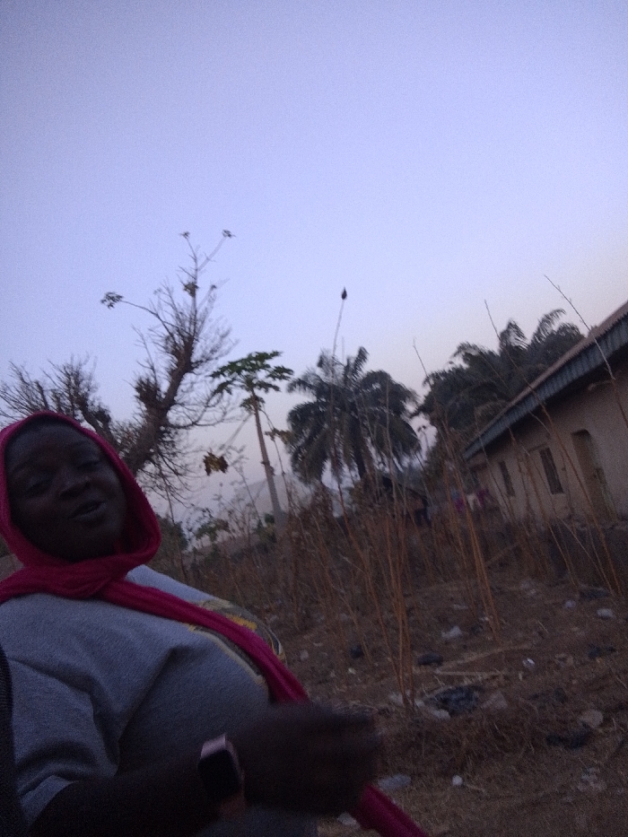 An outdoor shot presents a woman in the foreground wearing a pink headscarf and gray sweatshirt. She has an electronic device, possibly a smartwatch, on her wrist. Behind her is an open field of dry grass and scattered debris. A building with visible doors and windows is in the background, along with trees, including a palm tree, against a twilight sky. The image is taken at dusk or dawn, providing a somber mood.