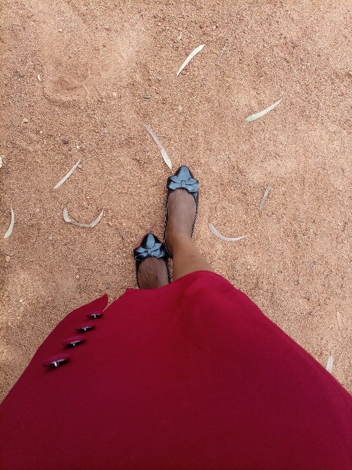 The image, taken in Kuru Dungus, Nigeria, shows an overhead view of a person's lower body, specifically their legs and feet, on a sandy ground surface. The person wears a dark red skirt or dress, visible from the upper thigh down, featuring three prominent silver-colored buttons or fasteners vertically aligned on the left side of the garment. They are wearing a pair of black, patent-leather, pointed-toe flat shoes, each adorned with a bow detail on the vamp. The visible skin of the legs and feet is a medium-dark complexion. The ground consists of fine, light brown or reddish-brown sand, scattered with multiple dried, elongated, light-colored leaves or plant debris. The person appears to be standing or in the process of walking.