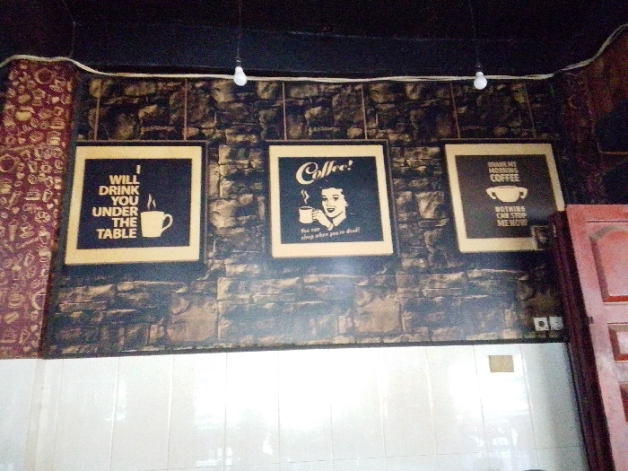 Three framed coffee-themed posters hang on a brick-patterned wall