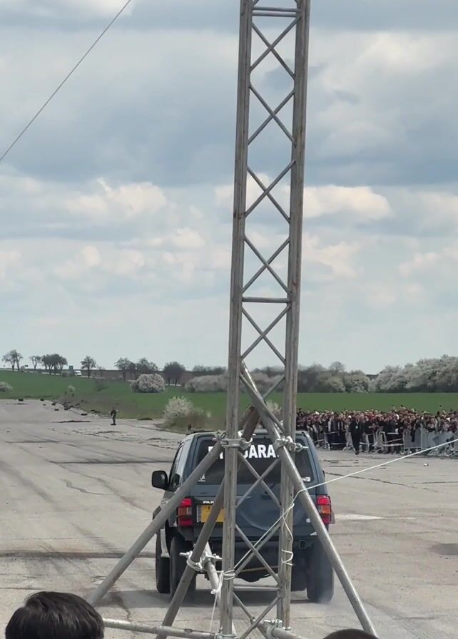dark-colored SUV with "RTG GARAGE" written on its back as it accelerates on a dusty track. Smoke comes out of the exhaust pipe. The car drives down the track, passing a person walking on the side and another vehicle waiting. The SUV is viewed from behind a crowd of spectators holding phones, and a metal tower structure is in the foreground. The sky is cloudy and there is a green field in the distance with some trees.