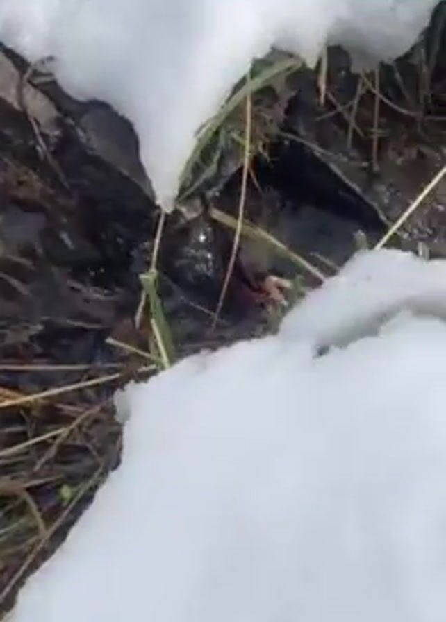 small stream of water flowing through a snowy landscape. Patches of snow are visible on the ground, along with green grass and dried, brown vegetation. The stream appears dark and clear as it moves through the area.