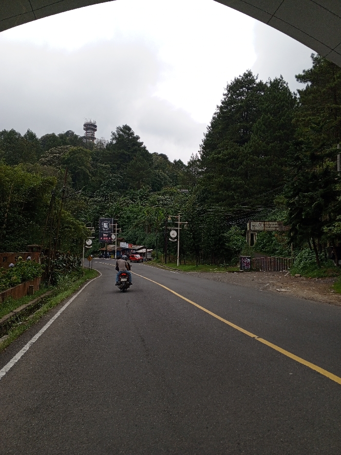 The image depicts a two-lane asphalt road curving gently to the left, framed from a slightly elevated vantage point beneath an architectural overhang. The scene is located in a heavily vegetated, hilly area. In the midground, a lone individual on a dark-colored scooter travels away from the viewer in the left lane. The rider wears a dark shirt and blue jeans. The road features a continuous yellow dividing line and a white shoulder line on the left. To the immediate left of the road, a concrete planter containing green foliage and a drainage ditch are visible. Further down the road on the left, a cluster of small commercial structures or stalls with a red vehicle parked nearby is present. Multiple decorative poles with circular signs and a larger black rectangular sign are positioned along this side. The right side of the road exhibits an unpaved shoulder leading into dense green foliage. A partially obscured structure with graffiti is visible amongst the vegetation. The background is dominated by a range of hills densely covered with tall, dark green trees. On the highest visible peak, a distinctive multi-tiered tower structure, possibly an observation or communication tower, stands against a uniformly overcast, light grey sky. The overall environment is rural or semi-rural, characterized by abundant natural growth. This scene is identified as being located in the city of Multhan, India.