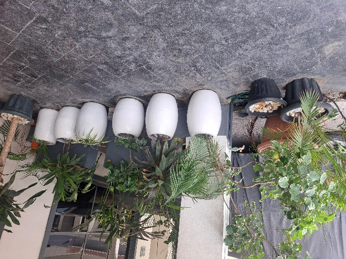 The scene depicts an outdoor paved area in Igboefon, Nigeria, furnished with various potted plants. The foreground features a dark gray, textured pavement. On the left, two black plastic planters contain plants; one has a palm-like plant with white decorative stones, and another contains brown decorative stones. A coiled green garden hose and a small metallic faucet are partially visible behind these planters. A linear arrangement of seven white, ovoid ceramic planters occupies the midground, each containing different types of green foliage, including broad-leafed and palm-fronded specimens. To the far right, a dark green plastic planter holds a small tree with white decorative stones at its base. In the background, against a light-colored building wall, several larger, dark rectangular planters are positioned, also containing various plants. Dark reflective windows of the building facade are visible, along with a portion of a gray draped tarp or fabric on the far left. No individuals or discernible actions are present.
