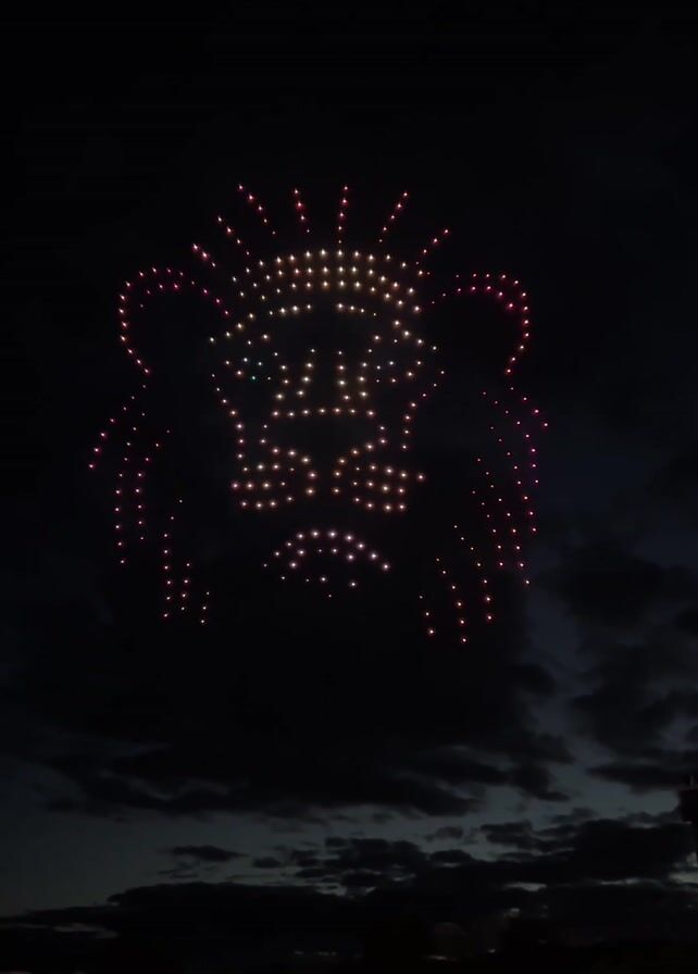 . The video shows a drone light show creating the shape of a lion in the night sky. The lion's face is formed by numerous small lights that define its outline, mane, and features. The sky is dark with some visible clouds. In the foreground, there is a silhouette of people standing behind a fence, observing the display. One person is wearing a pink jacket.