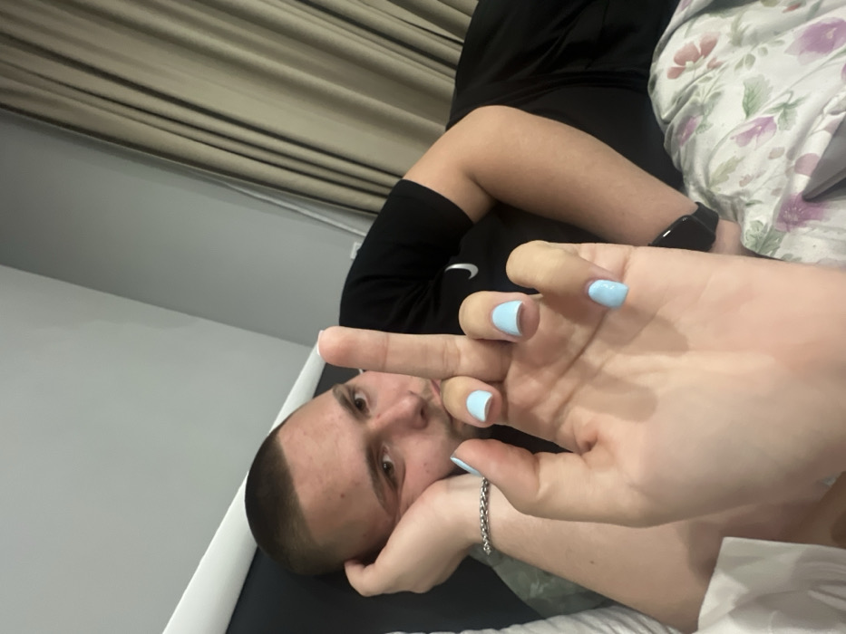 The scene depicts an indoor setting in Kribul, Bulgaria. A young adult male is visible, lying down with his head resting on his left hand. He has short, light brown hair and a light complexion. He is wearing a black t-shirt, and a silver-colored chain bracelet is on his left wrist. A dark-colored watch or fitness tracker is present on his right wrist. His gaze is directed towards the camera. In the immediate foreground, a female hand with light blue painted fingernails is prominent, displaying an offensive gesture with the middle finger extended upwards. The background shows a light grey wall and a beige or light brown curtain. Floral-patterned bedding, featuring white fabric with purple, pink, and green elements, is visible to the right.