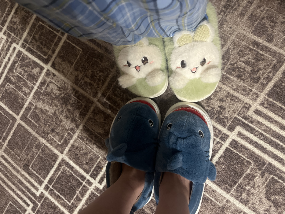 The scene depicts the lower legs and feet of two individuals in an indoor setting, specified as the city of Izhevsk, Russia. The specific location within the city is not visually discernible from the image. On the left, a person's bare feet are inserted into a pair of plush, blue shark-shaped slippers. Each slipper features an open mouth with visible red lining and white teeth. These slippers face towards the right. On the right, another person's feet are encased in a pair of plush, light green and white cartoon animal slippers, resembling rabbits or bears, complete with embroidered facial features and small ears. The legs of this individual are covered by blue and white plaid pajama bottoms, which extend down to the tops of the slippers. These slippers face towards the left. Both pairs of slippers are positioned on a carpeted floor. The rug features a repeating geometric pattern consisting of interlocking light-colored lines forming squares and diamonds on a darker, possibly brown or grey, background. The arrangement of the slippers suggests the two individuals are facing each other with their feet relatively close.