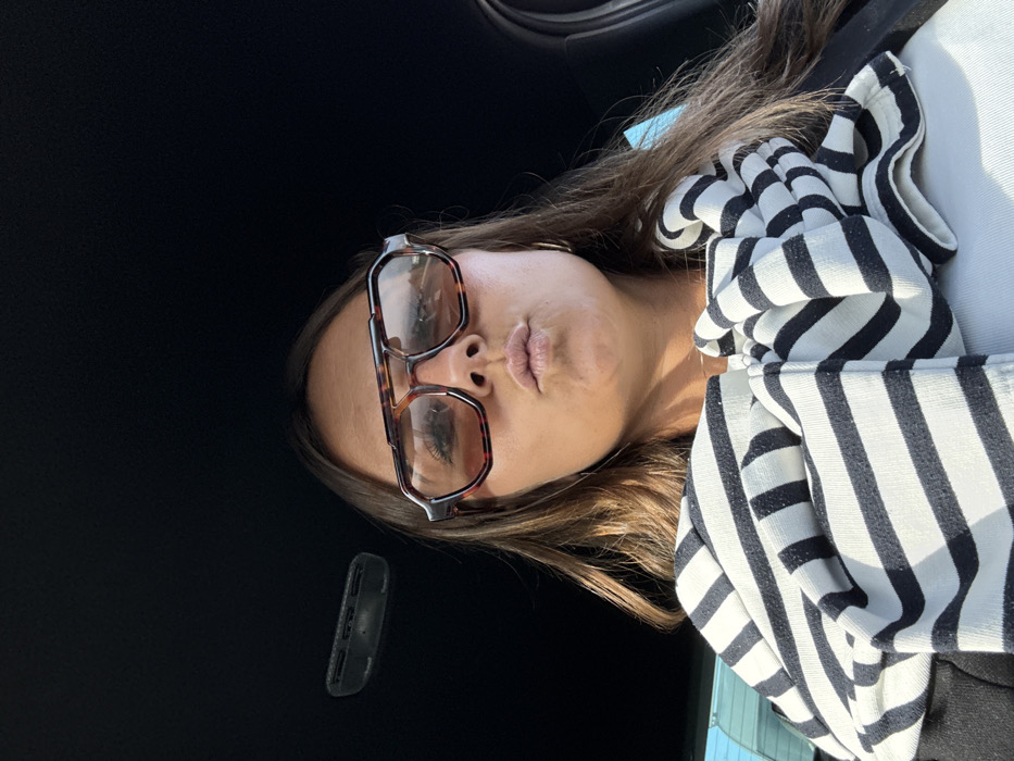 The scene, located in Saint-Jean-Bonnefonds, France, depicts an adult female posing for a low-angle selfie within the interior of a vehicle. The individual has medium-length brown hair and is wearing large, tortoise-shell patterned aviator-style sunglasses with light brown lenses. Her lips are pursed forward in a distinct pose. Small gold hoop earrings are visible on both ears. She is dressed in a white top, layered with a black and white striped garment, possibly a scarf or an element of a jacket, which features a gathered or ruched design around the neck and upper chest. The vehicle's interior is dark, with a black headliner and an overhead console visible. A partial view of a car window on the left reveals a reflection of a blue sky or distant landscape, indicating an outdoor, daytime setting.